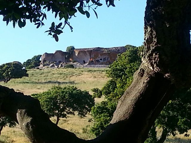 Dopo aver visitato l’importante basilica, sapientemente edotti dalle guide dell Associazione Inside-Outside, proseguiamo lungo una strada a tratti cementata, a tratti sterrata. Un percorso che si snoda attraverso scenari bucolici di colline verdeggianti , mucche al pascolo , laghetti, querce e olivastri secolari, imperturbabili custodi della storia.
